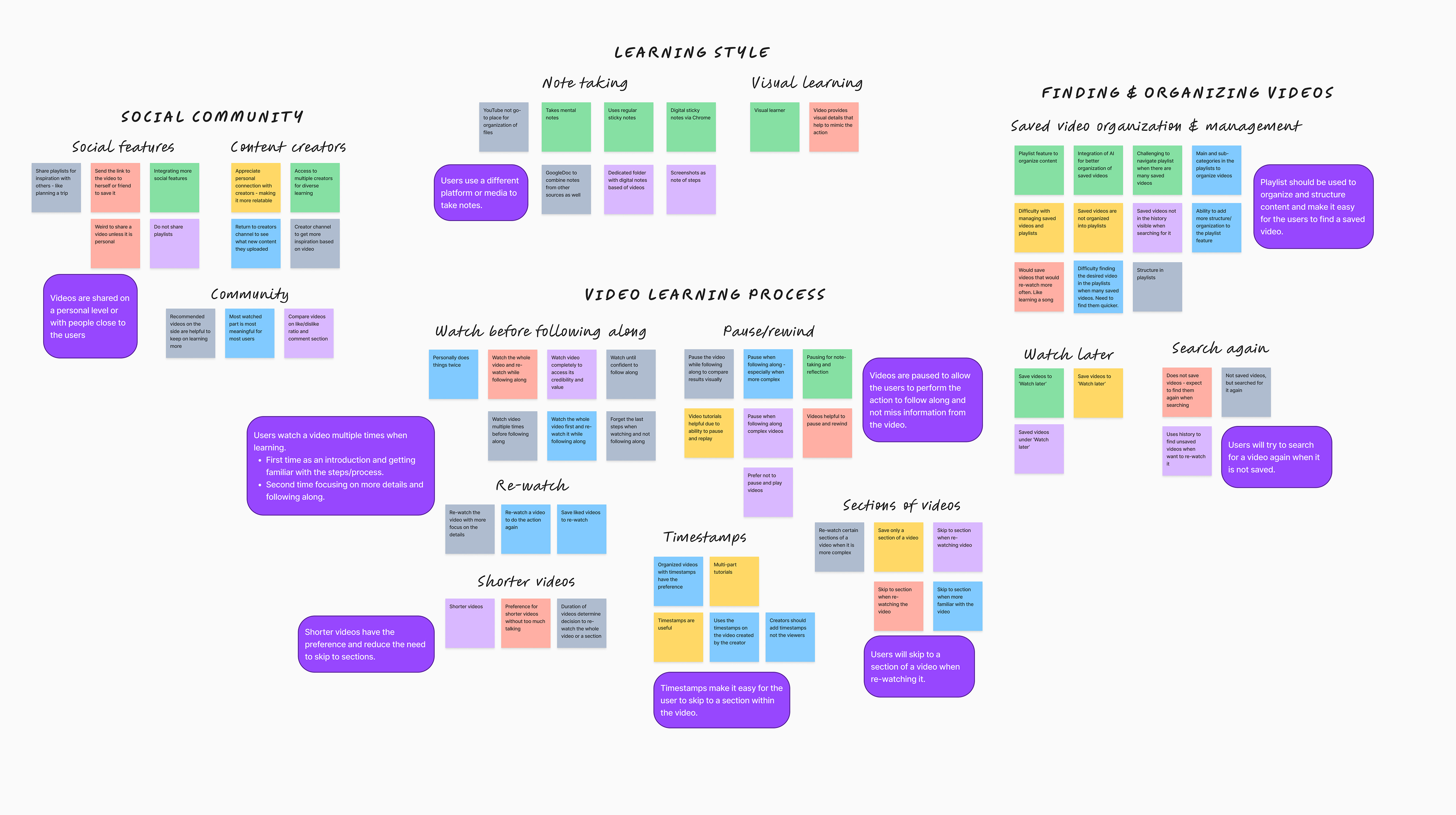 The affinity map helped to identify insights from all research and to see patterns and overarching themes. It also highlighted insights that were less directly related to the original goal, which focused more on tutorial-style videos.