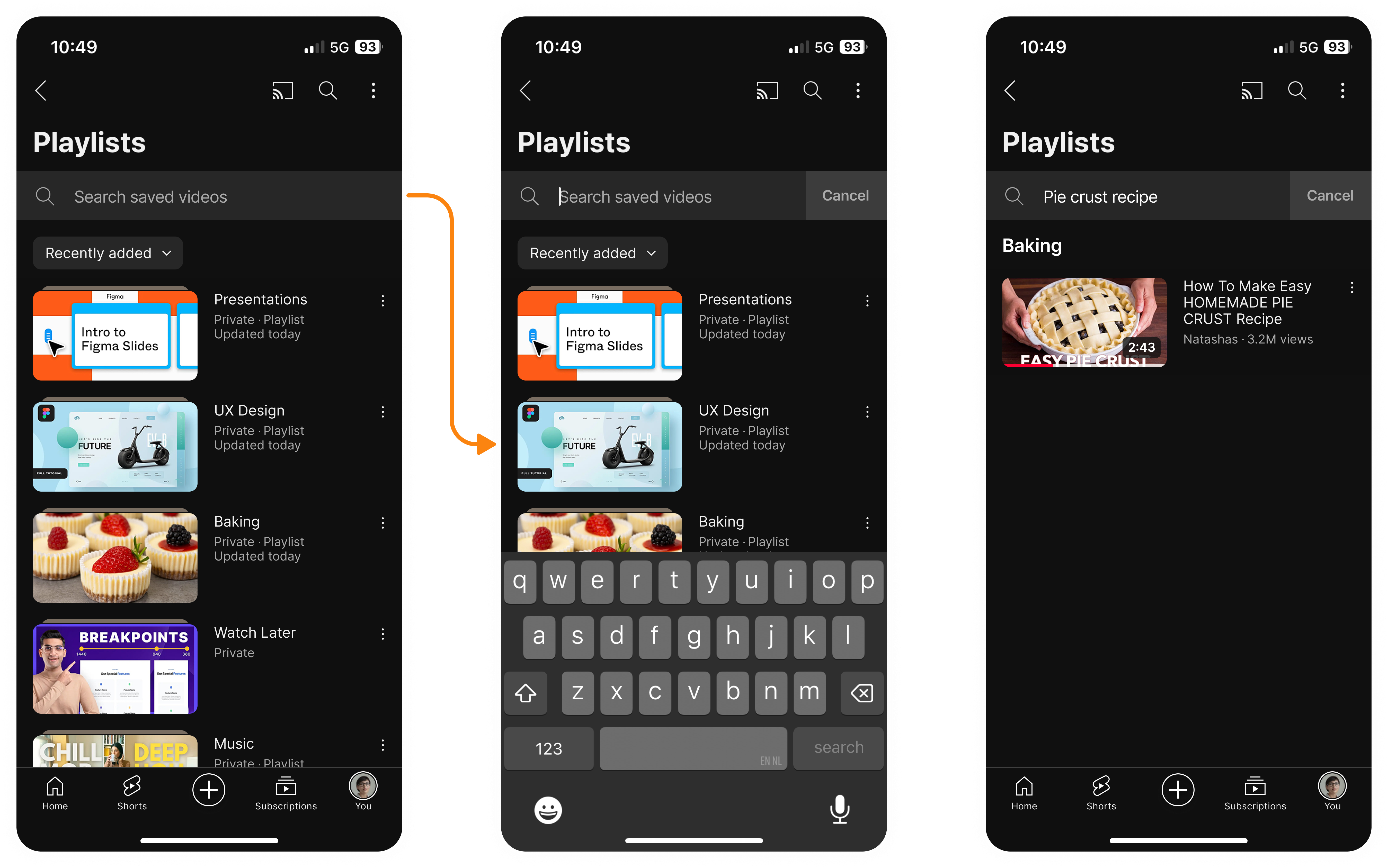 I designed a search feature to address this issue, aiming to make it easier for users to find saved videos within their playlists. Early usability testing with a mid-fidelity prototype revealed that the feature did not function as intended. Users were unfamiliar with the new feature, highlighting the importance of clear onboarding and user education.