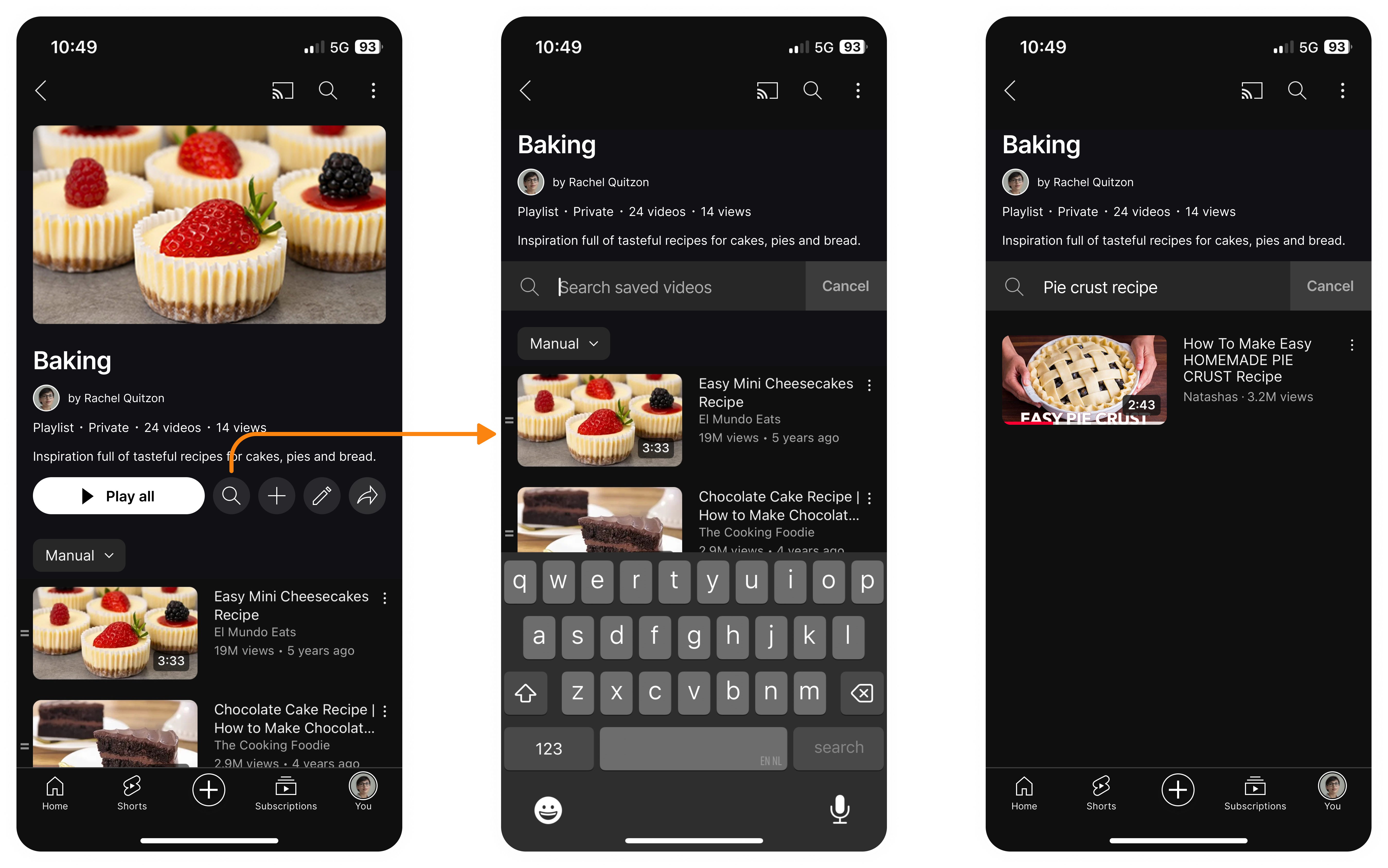 The global search has been adjusted so that it allows users to search within all videos, their saved videos, and their viewing history. Making it more clear to the user how to interact with it while leveraging existing interactive elements within the YouTube interface.