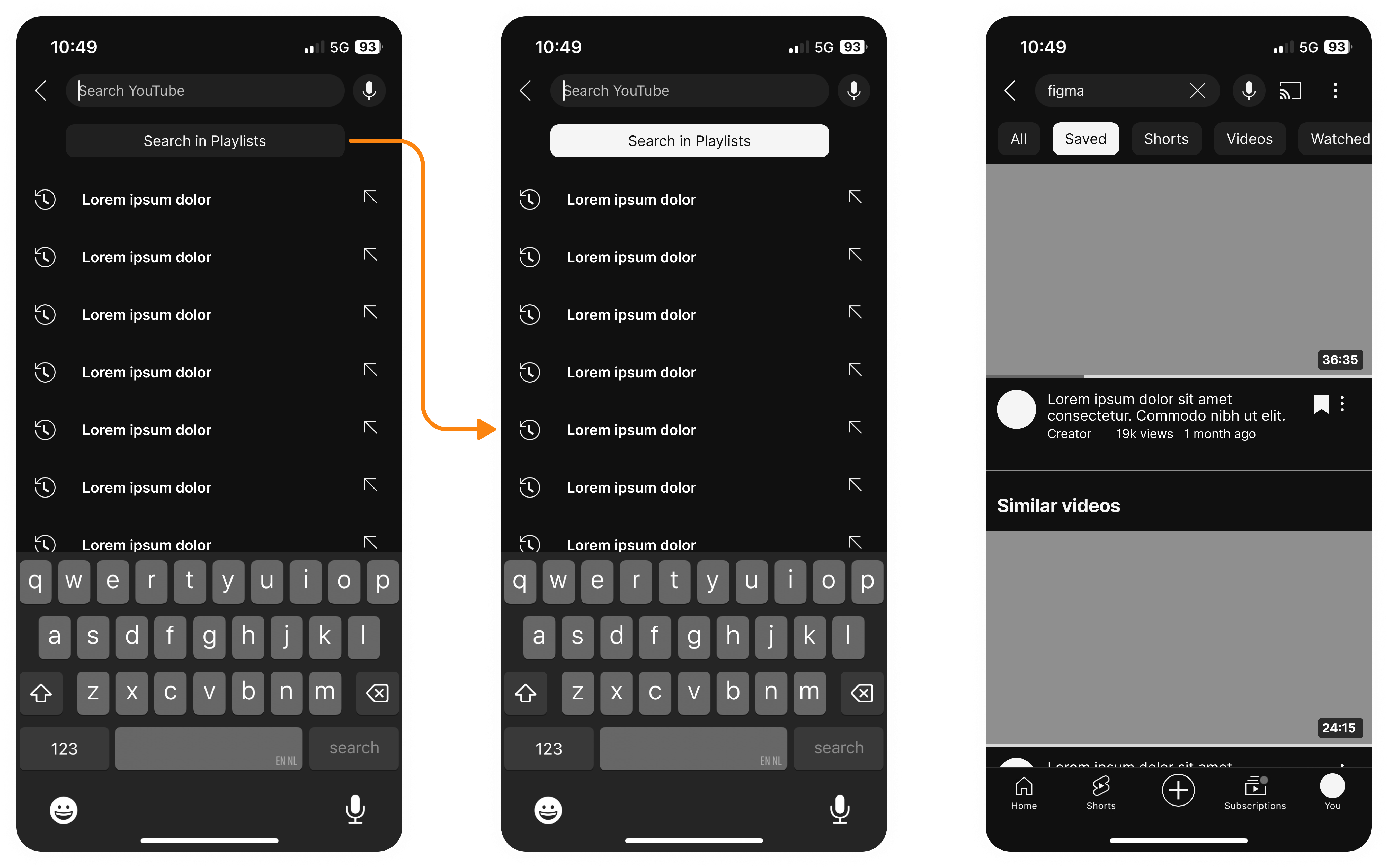 A variety of ideas were explored on how to add a feature to the global search that allows users to search within their saved playlists. Existing YouTube elements were used as inspiration and criteria for decision-making. It was really helpful for me to utilize screenshots of the existing YouTube app and thereby speed up the mid-fidelity wireframe creation process.