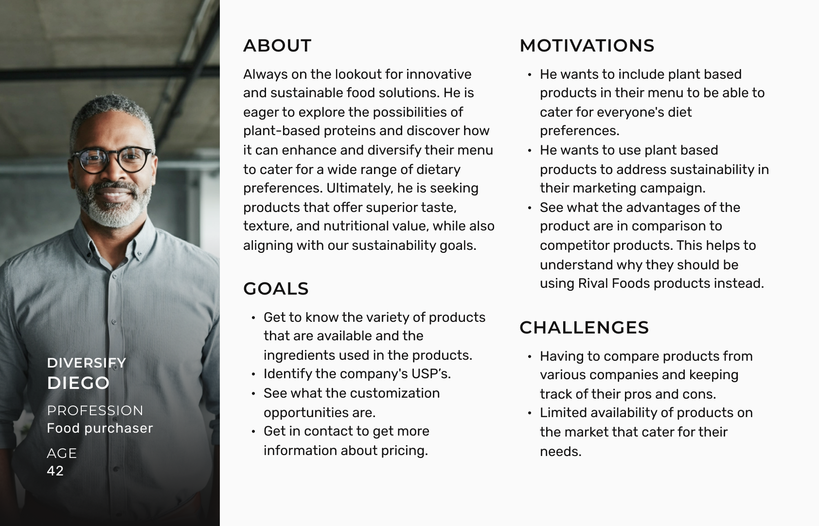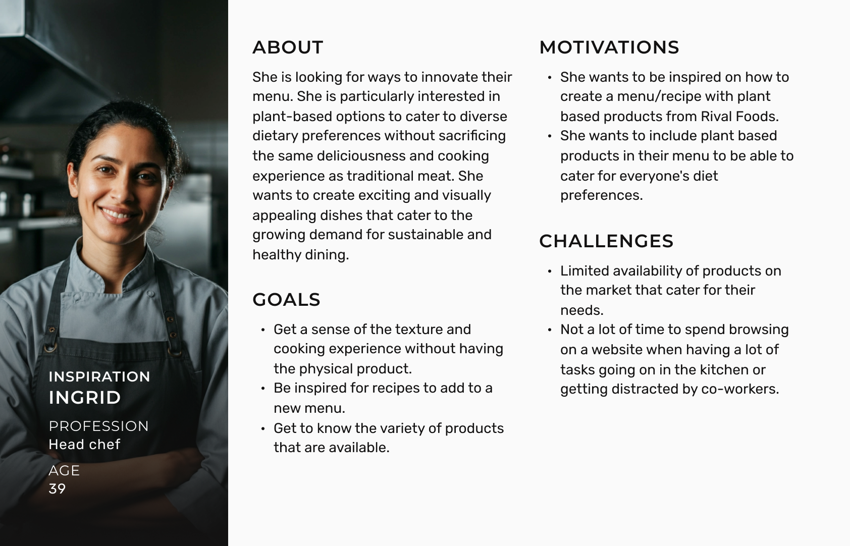 This interview provided valuable insights into the different target audiences, their key challenges, and their primary motivations for visiting the Rival Foods website.